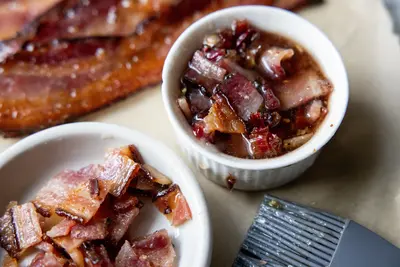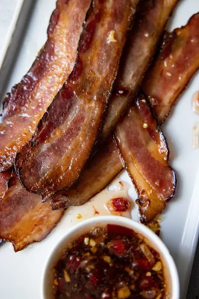 - Arrange bacon in a single layer on a baking sheet. Bake in pre-heated oven for 12-15 minutes. Brush tops of bacon with half of rhubarb syrup. Bake 5 minutes more, then flip bacon and brush the other sides with remaining syrup. Continue baking until glossy and most of fat has rendered but bacon is still pliable (it should not crisp), 12 to 15 minutes more.