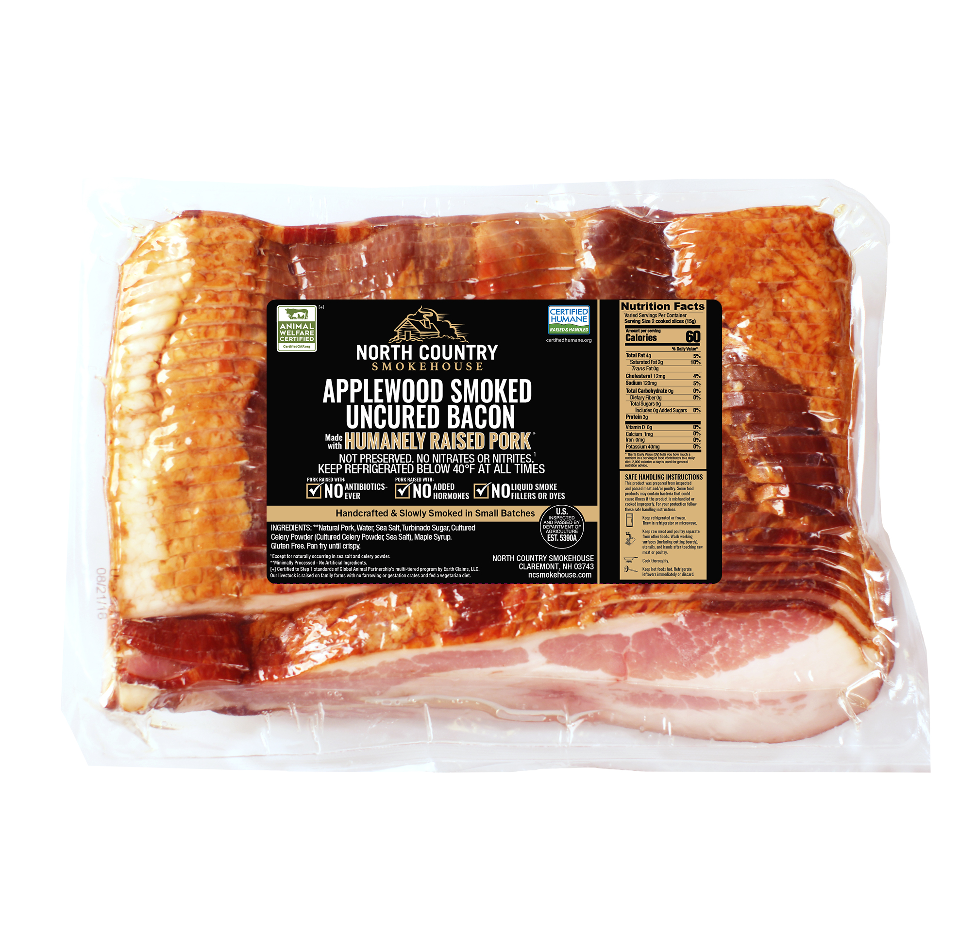 Over the years, we’ve had customers ask for a robust, smoky bacon that’s made without some of the ingredients found in traditionally cured recipes. This farmhouse-style, all natural bacon is marinated in real maple syrup and smoked lazily, for hours on end over choice hardwoods to create the rich, smoky flavor we’re well-known for. Our uncured Applewood Smoked Bacon is all-natural, humanely raised, antibiotic-free, and handcrafted without chemical preservatives.