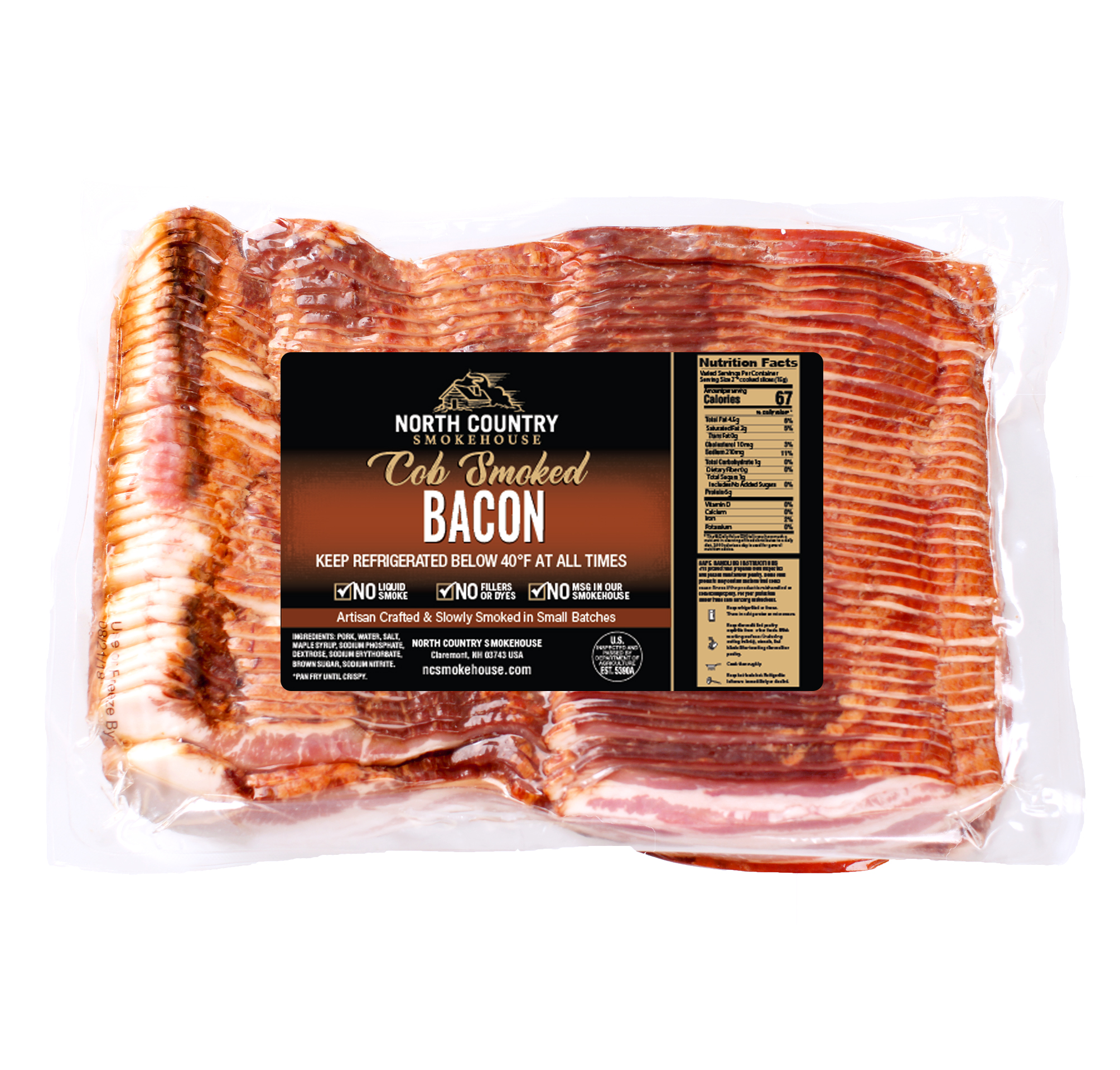 We pay tribute to the early farmers’ hard work and tradition by producing a Cob Smoked Bacon. The robust flavor is a staple throughout New England; cured in sweet maple syrup and select spices, the slabs are smoked low & slow for hours on end. Corn cob smoking was passed on to settlers by the area’s native Abenaki people as a natural way to preserve meat.