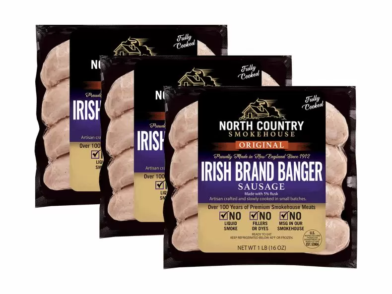 Using a traditional Emerald Isle recipe that combines pork, spices, and rusk (bread crumbs), this mild star of the pub favorite bangers and mash is steamed rather smoked.