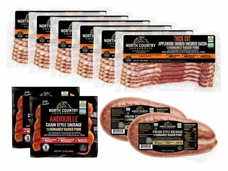 Thick-cut bacon fans – this bundle is for you! Six-packs of maple-infused, Uncured Applewood Bacon plus 4 signature sausage flavors in one box.